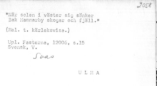 //// J ar* //// "När solen i väster sig sänker Bak Hammarby skogar och fjäll." : //// (Mel. t. kärleksvisa.) //// Upl. Fasterna, 12006, s.15 Svensk, V. //// ^ U L M A ////