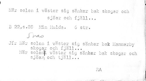 //// ¦ //// När solen i väster sig sänker bak skogar och //// sjöar och fjäll... //// B 22fs.38 Min Hulda. 6 str. //// J lA^UO //// Jfr När solen i väster sig sänker bak Hammarby //// skogar och fjäll... När solenjp. väster sig sänker bak skogar och sjöar* och tjäll.* « //// RA //// vt! //// . ~ *\ >, - •. *' ~ ////