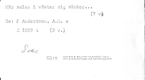//// När solen i väster sig sänker.«. //// (7 vfc //// Se: F Andersson, A.II. a //// i //// 2 1889 t (2 v.) //// S. //// KB: G SKILLI NGT RYCKS REG. ////