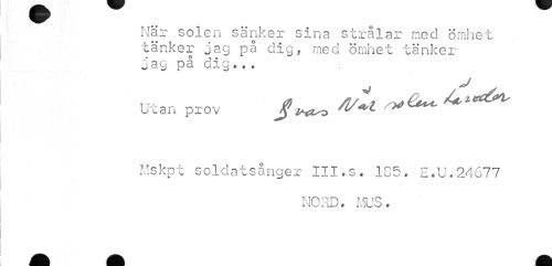 //// När solen sänker sina strålar med ömhet //// tänker jag på dig, med ömhet tänker ' ° i • j39 &-9•* * //// v J s //// it' 0 An*^ //// Uxan prov \ ^ 6 //// Mskpt soldatsånger III.s. 185. E.U.24677 //// NORD. MUS. ////