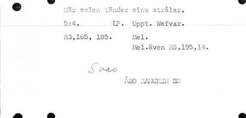 //// ^^ När solen tänder sina strålar, ___5; 4.___LF._Uppt. V/ef var.___ //// R3,165, 135. Mel. //// Mel.även R6,195,14. //// £ IS-4UO //// ÅBO RANCKZN 23 ////