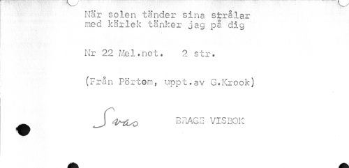 //// När solen tänder sina strålar //// med kärlek tänker jag på dig //// . ... //// i //// Nr 22 Mel.not. 2 str. (Från Pörtom, uppt.av G.Krook) //// ^ ^J^-zto BP AGE VISBOK ////