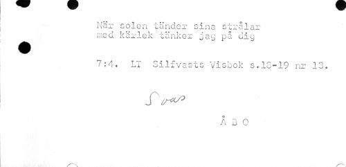 //// Nar solen tänder sina strålar med kärlek tänker jag på dig //// 7:4, LT Silfvasts Visbok s.18-19 nr 13. //// s ^ //// ÅBO ////