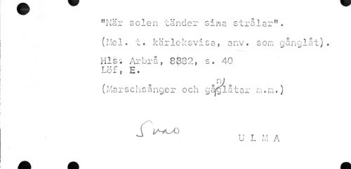 //// "När solen tänder sina strålar11. //// (Mel. t. kärleksvisa, an v. som gånglåt). //// Hiss Arbrå, 8832, s. 40 Löf, E. //// o ty o //// (Marschsånger och gåglåtar m.m.) //// ( 2AA-X) //// ^ U L M A ////