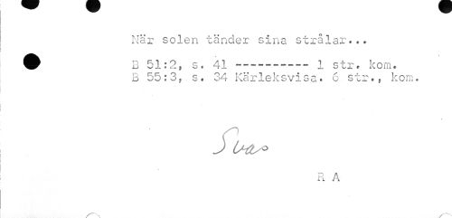 //// När solen tänder sina strålar.•• //// • i //// B 51:2, s. 41---i str. kom. //// B 55:3, s. 34 Kärleksvisa. 6 str., kom. //// J //// R A ////