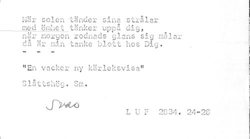 //// Kär solen tänder sina strålar //// _med ömhet tänker uppå dig, //// när morgon rodnads glans sig målar då är min tanke blott hos Dig. //// "En vacker ny kärleksvisa" S låt t.s hö g. Sm ? //// jy^o //// L U F 2834. 24-28 ////