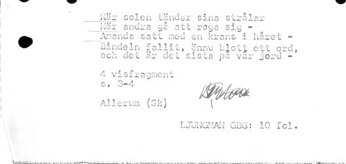 //// 5 //// Här solen tänder sina strålar När andra ga att roga sig -Amanda satt med en krans i håret - //// Bindeln fallit, ännu bJo t £ ett ord, och det är det sista pa var jord - //// 4 visfragment //// Allerum (Sk) | //// v LJUNGMAN GBG: 10 fol. //// i //// I //// J_«. 'i___j__L 'il ___ ... »4 , ^ . . ---___^-wA.___ , - L^S--v. >i---. ___—-. ./•^"TV-.r—--- xlt ////