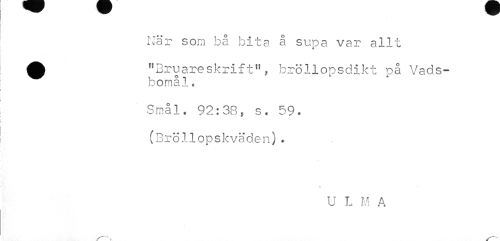 //// När som bå bita å supa var allt //// 0 "Bruareskrift", bröllopsdikt på Vads- //// bomål. //// Smål. 92:38, s, 59. (Brollopskväden). //// % //// U L M A ////