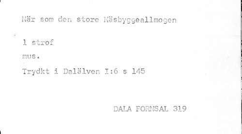 //// När som den store Näsbyggeallmogen //// v ? //// 1 strof //// nu s.. //// Trydkt i Dalälven 1:6 s 145 //// DALA FORNSAL 319 ////