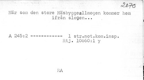 //// • - - °ZJ>Tt3 //// När som den store Näsbyggeallmogen kommer hem //// ifrån slogen... //// ¦ //// A 245:2 --- 1 str.not .korn.insp. //// Rtj. 10660:1 y //// RA I ////