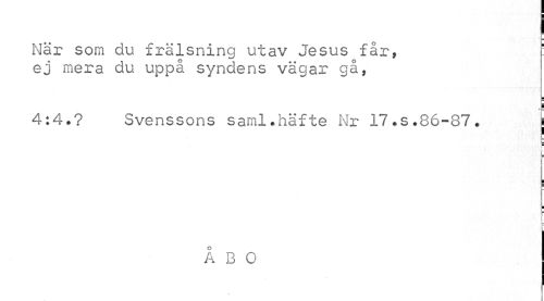 //// När som du frälsning utav Jesus får, ! //// ej mera du uppå syndens vägar gå, //// 4:4.? Svenssons saml.häfte Nr 17.s.86-87. | //// i ¦ //// ¦ //// i //// t //// Å B O ////