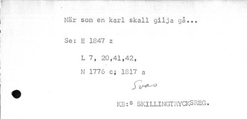 //// . ... //// - - //// - ¦ • : //// När som en karl skall gilja gå... //// Se: E 1847 z //// L 7, 20,41,42, //// 0 //// N 1776 c; 1817 a //// KB:s S Kl LLI NGT RYCKS REG. ////