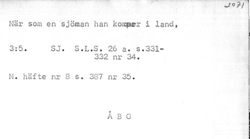 //// VJ^ w M //// ' ';• ' ' ' ; . a ' ' '' ¦ ) //// När som en sjöman han korap^r i land, //// > //// ¦ //// 3:5. SJ. S.L.S. 26 a. s.331- //// 332 nr 34. //// N. häfte nr 8 s. 337 nr 35. //// / //// ÅBO ////