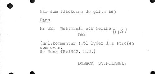 //// När som flickorna cle gifta sej Dans //// Nr 32. Westmani. och Nerike * , //// Dbk Ull' //// (Enl.kommentar s.51 lyder l;a strofen som ovan. //// Se Runa förl842. h.2.) //// DYBECK SV.FOLKMEL. ////