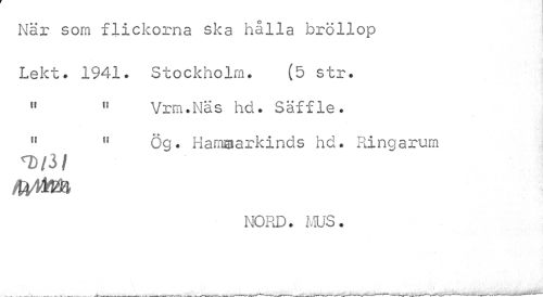 //// N-är sorn flickorna ska hålla bröllop //// Lekt. 1941. Stockholm. (5 str. 11 " Vrm.Näs hd. Säffle. //// .-i //// " " Ög. Hamaarkinds hd. Ringarum //// T)/3/ //// tto/itom //// NORD. MUS. ////