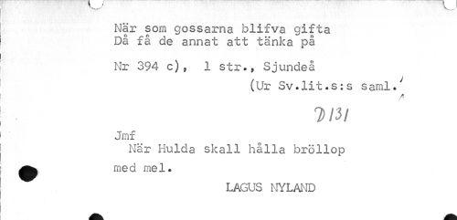 //// När som gossarna blifva gifta Då få de annat att tänka på //// Nr 394 c), 1 str., Sjundeå //// (Ur Sv.lit.s:s saml*' //// / //// 7>/3/ //// Jmf //// När Hulda skall hålla bröllop ^^ me d rne 1. //// LAGUS NYLAND ////