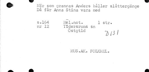 //// När som grannas Anders håller slåttergänge Då får Anna Stina vara med //// s.164 Mel.not. 1 str. //// nr 12 Tldersrums sn //// Östgtld 7) / ? / //// MUS.AK. FOLKMEL. //// \ ////