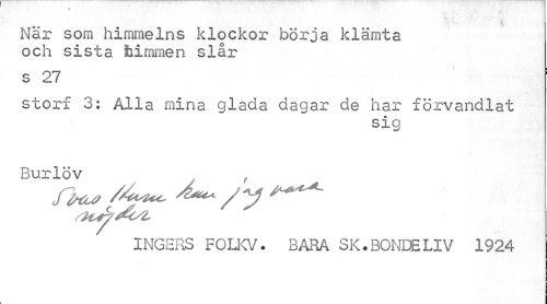 //// .Vi. ' • • //// ' % //// Nar som himmelns klockor börja klämta och sista timmen slår4 //// s 27 //// storf 3: Alla mina glada dagar de har förvandlat //// sig //// Burlöv //// Si** /W. /y ^^ //// INGERS FOLKV. BARA SK.BONDELIV 1924 ////