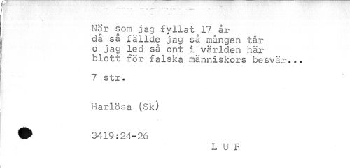 //// I //// När som jag fyllat 17 år då så fällde jag så mången tår o jag led så ont i världen här blott för falska människors besvär... //// 7 str. //// Harlösa (Sk) //// or //// • 3419:24-26 //// LUF ////
