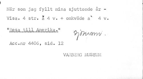 //// När som jag fyllt mina sjuttonde år -Visa. 4 str. a 4 v. + omkväde a^ 4 v. //// "Resa till Amerika.11 //// Acc.nr 4406, sid. 12 //// VARB2RG MUSEUM ////