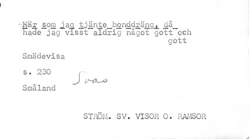 //// •¦•Här .som j^ac? tjänte^bonddräng^ då_ hade jag visst aldrig något gott och //// gott //// Smädevisa s. 230 //// J LHX^O //// Småland //// STRDM• SV. VISOE O. RAMSOR ////
