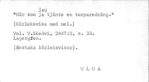 //// .jag //// nMär som ja tjänte en torparedräng?11 //// (Kärleksvisa med me 1 •) //// Vrnl. V.Skedvi, 2447:2, s. 33. Lagergfen. //// (Enstaka kärleksvisor). //// U L M A ////