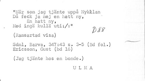//// "När som jag tjänte uppå Nykklan Då feck ja mej en hatt ny, //// En hatt ny, Med inga kulla uti;/:" ^ //// (Ramsartad visa) //// Sdml, Barva, 347:43 s. 3-5 (Bd fol.) Ericsson, Gust (bd 16) //// (Jag tjänte hos en bonde.) //// ULMA //// i ////