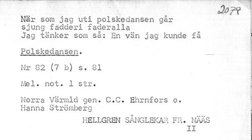 //// Nar som jag uti polskedansen går sjung fadderi faderalla //// Jag tänker som så: En vän jag kunde få 1 //// Polskedansen* _ //// il—... IWI4—IWM //// Nr 82 (7 b) s. 81 Mel. not. 1 str. //// Norra Värmld gen. C.C. Ehrnfors o. Hanna Strömberg //// HELLGREN SÅNGLEKAR FR. NÄÄS //// II ////