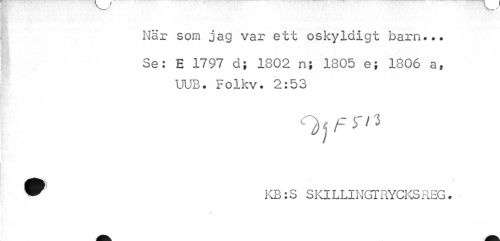 //// När som jag var ett oskyldigt barn... //// Se: E 1797 d; 1802 n; 1305 e; 1806 a, UUB. Folkv. 2:53 //// * KB:S SKILLINGTRYCKSREG. ////