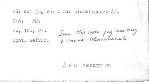 //// När som jag var i min blomstrandes år, //// c 14• MM• //// R3, 165, 21. ^ ^ //// Uppt. Wefvar. ^ r**^^- (^r^h^^- //// ÅBO RANCKEN MS ////