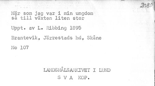 //// När som jag var i min ungdom så till växten liten stor //// ¦ ¦ //// Uppt. av L. Ribbing 1895 Brantevik, Järrestads hd, Skåne No 107 //// LANDSMÅLSARKIVET I LUND //// SVA KOP. ////