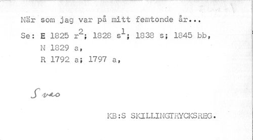 //// A! //// • , //// När som jag var på mitt femtonde år... //// Se: E 1825 r2; 1828 s1; 1838 s; 1845 bb, N 1829 a, R 1792 a; 1797 a, //// J ^to //// KB:S SKILLINGTRYCKSREG. ////