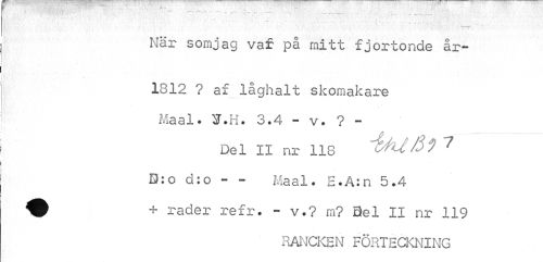 //// ¦ • .-• •• • ... • ! När somjag var på mitt fjortonde år- //// 1812 ? af låghalt skomakare Ma a1. ¥.H. 3.4 - v. ? - //// Del II nr 118 l J 1 //// Eko d:o - - Maal. H.A:n 5.4 + rader refr. - v.? m? Sel II nr 119 //// RANCKEN FÖRTECKNING ////