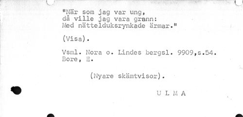 //// N. A* //// "När som jag var ung, då ville jag vara grann: Med nättelduksrynkade ärmar•11 //// (Visa). //// Vsrnl. Nora o. Lindes bergsl. 9909,s.54. Bore, E. //// • * //// (Nyare skämtvisor). //// k //// 'v ////