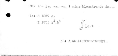 //// När som jag var ung i mina blomstrande år... //// ^ Se: N 1S59 a, //// E 1853 z |b (C //// J lr //// KB: q SKILLINGTRYCKSREG. ////