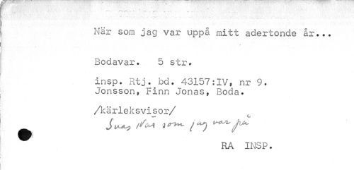 //// - //// När som jag var uppå mitt adertonde år... //// Bodavar. 5 str. //// Insp. Htj. bd. 43157:IV, nr 9. Jonsson, Finn Jonas, Boda. //// /kärleksvisor/ //// St^p /^M //// ^ RA INSP. ////