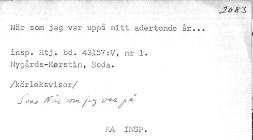//// - • • -j När som jag var uppå mitt adertonde år... //// ¦ ¦ //// insp. Rtj. bd. 43157:V, nr 1. Nygårds-Kerstin, Boda. //// /kärleksvisor/ //// /f syn*- i/** //// ¦ //// RA INSP. ////