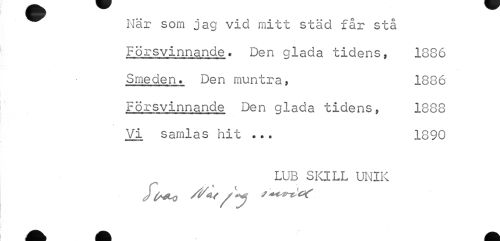 //// När som jag vid mitt städ får stå //// Försvinnande. Den glada tidens, 1886 //// Smeden* Den muntra, 1886 //// Försvinnande Den glada tidens, 1888 //// Vi samlas hit ... 1890 //// LUB SKILL UNIK ////