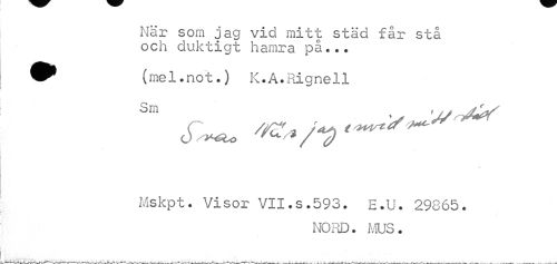 //// När som jag vid mitt städ får stå och duktigt hamra på... //// (mel.not.) K.A.Rignell //// Sm v 'J/n^ //// ef-*. ^ n < //// Mskpt. Visor VII.s.593. E.U. 29865. //// NORD. MUS. ////
