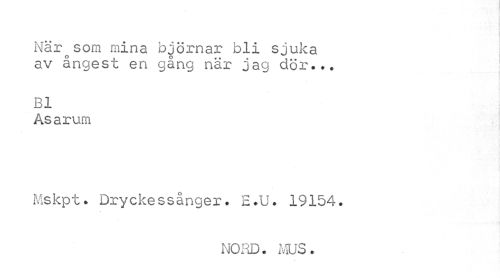 //// När som mina björnar bli sjuka av ångest en gång när jag dör... //// Bl //// Asarum //// Mskpt. Dryckessånger. H.U. 19154. //// NORD. MUS. ////