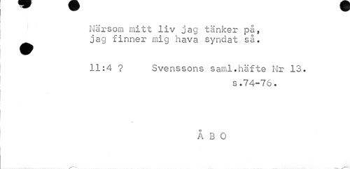 //// Närsom mitt liv jag tänker på, ^^ jag finner mig hava syndat så. //// 11:4 ? Svenssons saml.häfte Nr 13. //// s.74-76. //// ÅBO //// -rf"*"" "i- ////