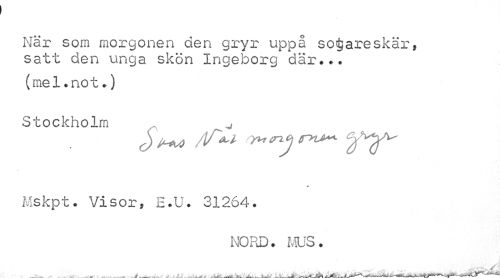 //// När som morgonen den gryr uppå sökareskär, satt den unga skön Ingeborg där... //// (mel.not*) //// Stockholm ^4 //// Mskpt. Visor, E.U. 31264. //// NORD. fCJS. //// . ... ... ... „i..—... MåA ////