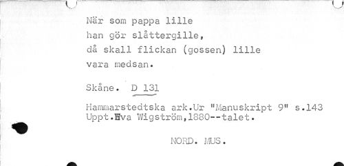 //// När som pappa lille han gör slåttergille, då skall flickan (gossen) lille vara ineds an. //// Skåne. ' D 131 //// Hammarstedtska ark.Ur "Manuskript 9" s.143 Uppt.Eva WigstrÖm,1880—talet. //// NORD. MUS. ////