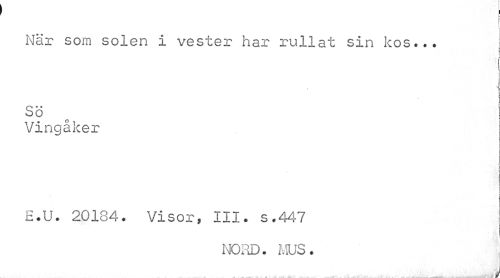 //// När som solen i vester har rullat sin kos... I //// fN ? • //// oo //// Vingåker //// i //// jr //// E.U. 20184. Visor, III. s.447 //// NORD. MUS. //// j ////