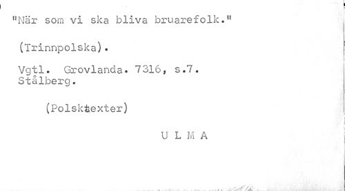//// "När som vi ska bliva bruarefolk." //// i //// (Trinnpolska). t //// ¦ //// i //// Vgtl. Grovlanda. 7316, s.7. Stålberg. //// (Polsktexter) //// U L M A ////