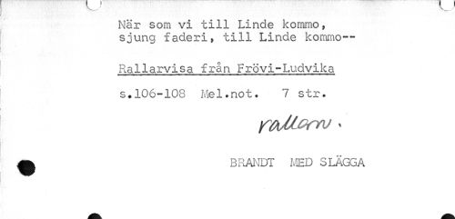 //// — X / //// När som vi till Linde kommo, sjung faderi, till Linde kommo— //// Rallarvisa från Frövi-Ludvika s.106-108 Mel.not. 7 str. //// A BRANDT MED SLÄGGA ////