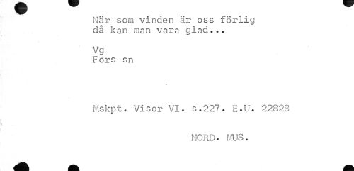 //// När som vinden är oss förlig då kan man vara glad... //// Vg //// Fors sn //// Mskpt. Visor VI. s.227. E.U. 22828 //// NORD. MUS. ////