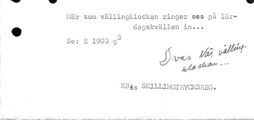 //// När som vällingklockan ringer ees på lör- //// # dagskvällen in... //// Se: E 1903 g^ ^ , //// KBss SKILLINGTRYCKSREG. ////