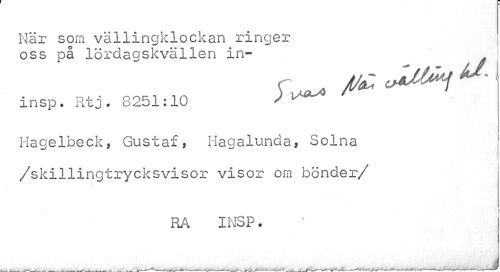 //// När som vällingklockan ringer oss på lördagskvällen in- //// insp. Rt j * 8251:10 ) //// Hagelbeck, Gustaf, Hagalunda, Solna /skillingtrycksvisor visor om bönder/ //// RÅ INSP. //// .. - « , - ___ ___ ___ - J ////