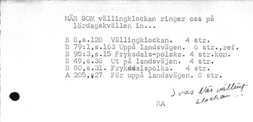//// NÄR SOM vällingklockan ringer oss på lördagskvällen in... //// B 8,s.l28 Vällingklockan. 4 str. B 79:1,s.163 Uppå landsvägen. 6 str.,ref. B 95:3,s.l5 Fryksdals-polska. 4 str.kom. B 49,s.36 Ut på landsväjen. 4 str. B 80,s.31 * Frykddalspolka. 4 str. A 205,$27 Fox* uppa landsvage //// n. 8 //// str. //// • FA ^^ ////